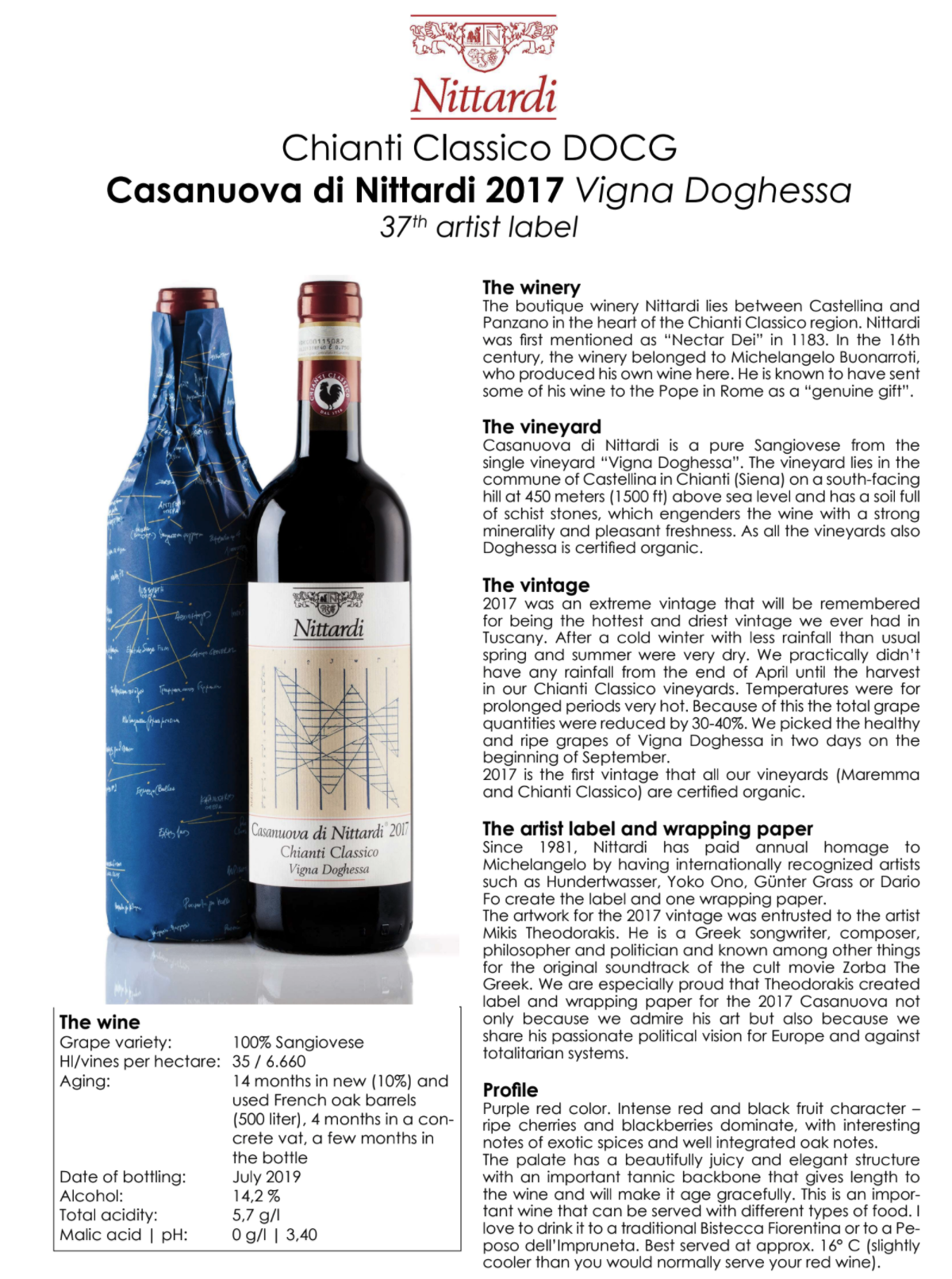 De eminente Chianti Classico 2017 ‘Vigna Doghessa’ met het fraaie etiket en fleswikkel dat door Mikis Theodorakis werd ontworpen. Theodorakis overleed op 2 september j.l.